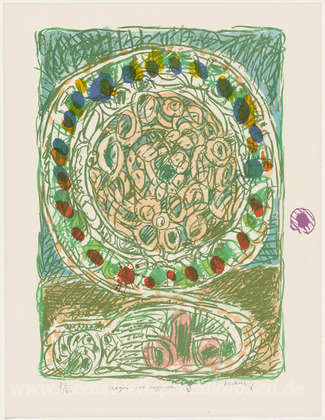 Wir bieten Ihnen eine handgefertigte Reproduktion auf Leinwand des berühmten Kunstwerks 'Al'Jotte Pie (Tarte Al'Jotte) aus dem Portfolio Bleistift auf Sh' von Pierre Alechinsky, aus dem Reproduktionsmuseum.