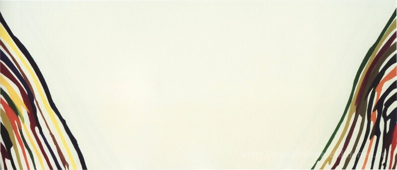 Wir bieten Ihnen eine handgefertigte Reproduktion auf Leinwand des berühmten Kunstwerks 'Alpha Tau' von Morris Louis, aus dem Reproduktionsmuseum.