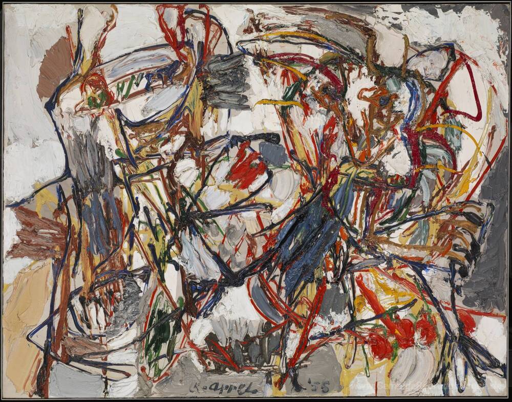 Wir bieten Ihnen eine handgefertigte Reproduktion auf Leinwand des berühmten Kunstwerks 'Amorous Tanz' von Karel Appel, aus dem Reproduktionsmuseum.