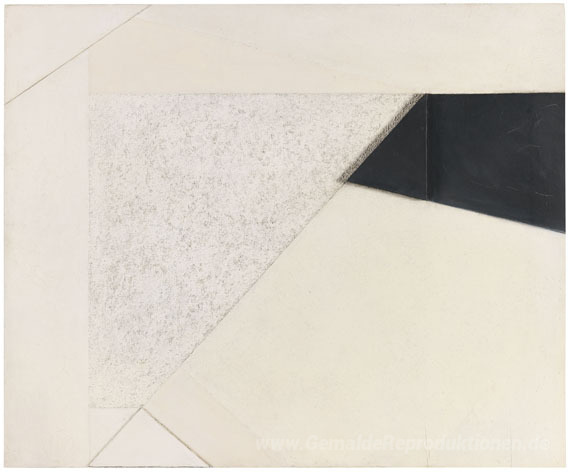 Wir bieten Ihnen eine handgefertigte Reproduktion auf Leinwand des berühmten Kunstwerks 'Bild mit schwarzem Keil' von Carl Buchheister, aus dem Reproduktionsmuseum.