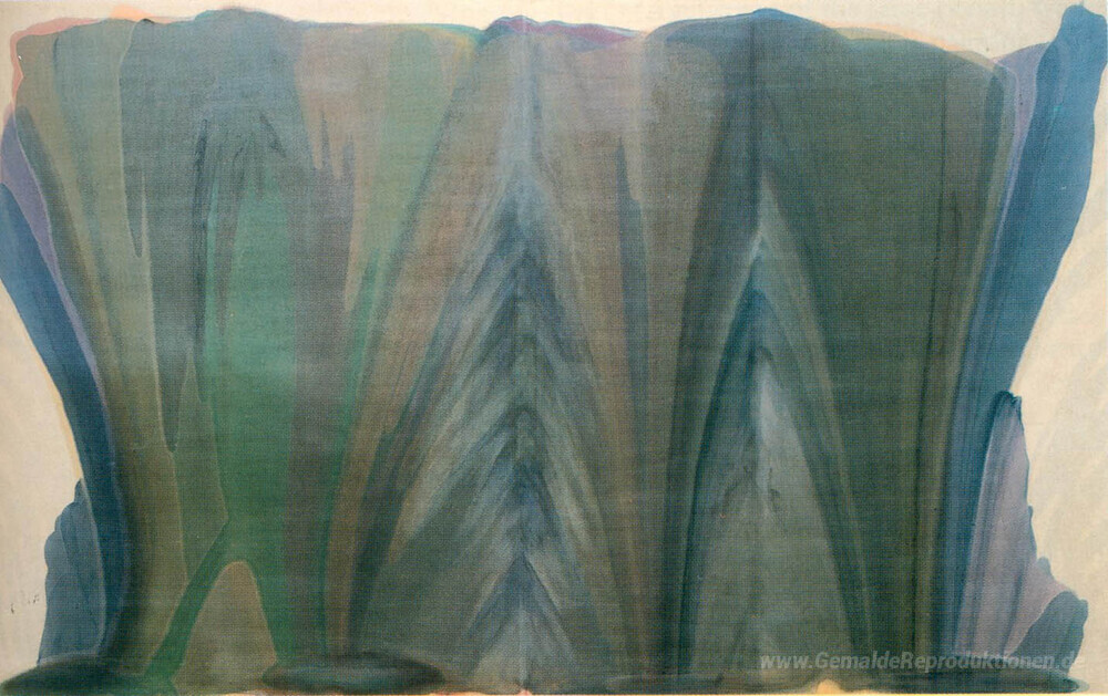 Wir bieten Ihnen eine handgefertigte Reproduktion auf Leinwand des berühmten Kunstwerks 'Blaue Schleier' von Morris Louis, aus dem Reproduktionsmuseum.