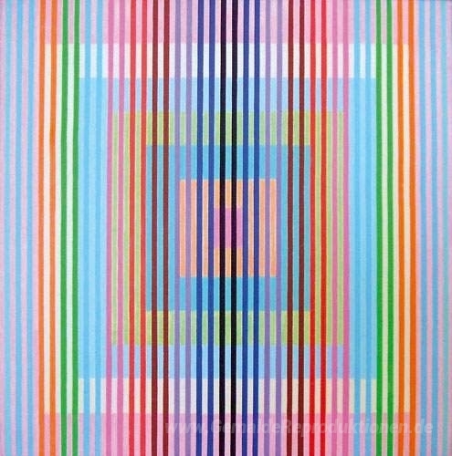 Wir bieten Ihnen eine handgefertigte Reproduktion auf Leinwand des berühmten Kunstwerks 'Chromographie x4: Graphisme chromatique sur carrés' von Gregorio Vardanega, aus dem Reproduktionsmuseum.