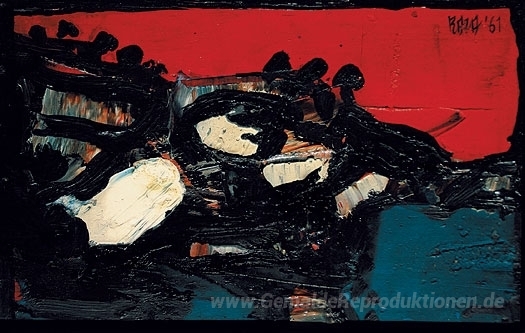 Wir bieten Ihnen eine handgefertigte Reproduktion auf Leinwand des berühmten Kunstwerks 'Ciel Rouge Sur Le Lac' von S. H. Raza, aus dem Reproduktionsmuseum.