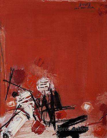 Wir bieten Ihnen eine handgefertigte Reproduktion auf Leinwand des berühmten Kunstwerks 'Composition rouge' von Chu Teh-Chun, aus dem Reproduktionsmuseum.