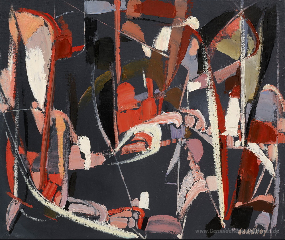 Wir bieten Ihnen eine handgefertigte Reproduktion auf Leinwand des berühmten Kunstwerks 'Composition sur fond ardoise' von Andre Lanskoy, aus dem Reproduktionsmuseum.