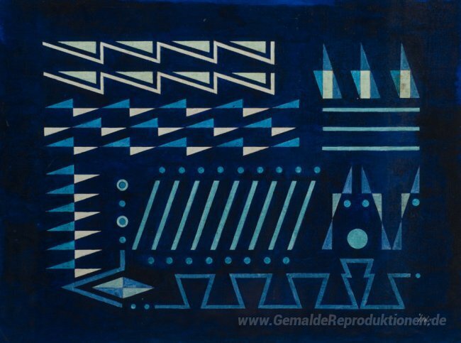 Wir bieten Ihnen eine handgefertigte Reproduktion auf Leinwand des berühmten Kunstwerks 'Composition sur fond bleu' von Yves Laloy, aus dem Reproduktionsmuseum.