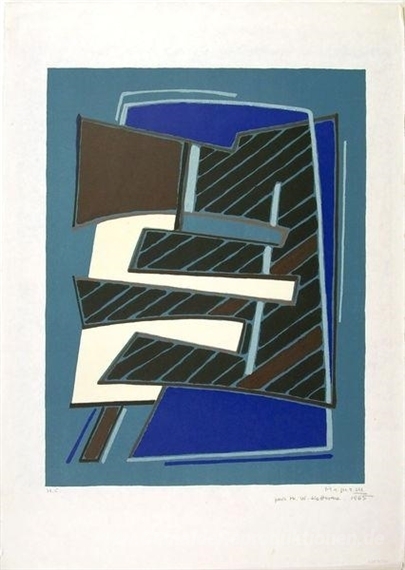 Wir bieten Ihnen eine handgefertigte Reproduktion auf Leinwand des berühmten Kunstwerks 'Composizione in Azzurro' von Alberto Magnelli, aus dem Reproduktionsmuseum.