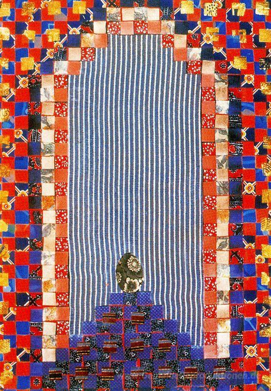 Wir bieten Ihnen eine handgefertigte Reproduktion auf Leinwand des berühmten Kunstwerks 'Das erste Theater' von Miriam Schapiro, aus dem Reproduktionsmuseum.