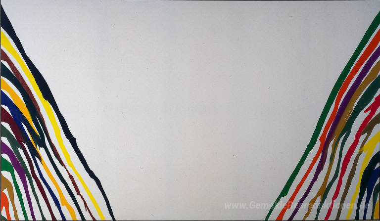 Wir bieten Ihnen eine handgefertigte Reproduktion auf Leinwand des berühmten Kunstwerks 'Delta Lambda' von Morris Louis, aus dem Reproduktionsmuseum.