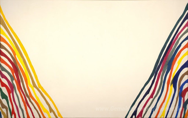 Wir bieten Ihnen eine handgefertigte Reproduktion auf Leinwand des berühmten Kunstwerks 'Delta Theta' von Morris Louis, aus dem Reproduktionsmuseum.