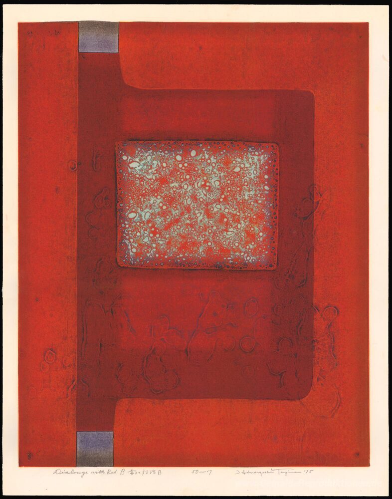 Wir bieten Ihnen eine handgefertigte Reproduktion auf Leinwand des berühmten Kunstwerks 'Dialog mit Rot (B)' von Hiroyuki Tajima, aus dem Reproduktionsmuseum.