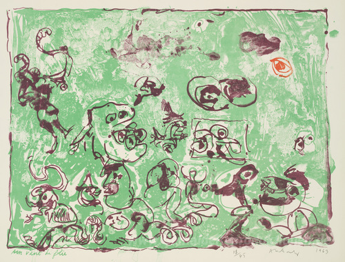 Wir bieten Ihnen eine handgefertigte Reproduktion auf Leinwand des berühmten Kunstwerks 'Ein Wind des Wahnsinns (Un vent de folie)' von Pierre Alechinsky, aus dem Reproduktionsmuseum.