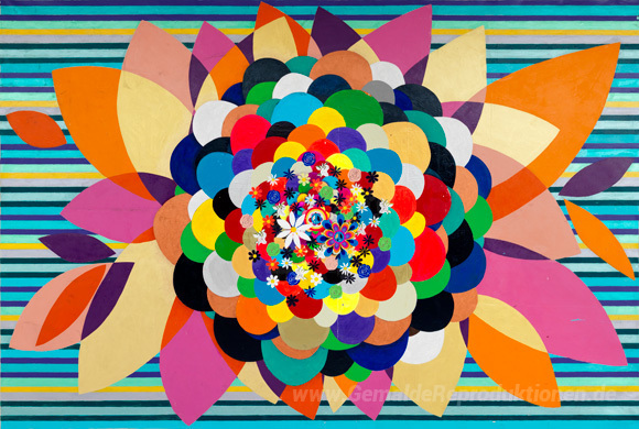 Wir bieten Ihnen eine handgefertigte Reproduktion auf Leinwand des berühmten Kunstwerks 'Frühlingsliebe' von Beatriz Milhazes, aus dem Reproduktionsmuseum.