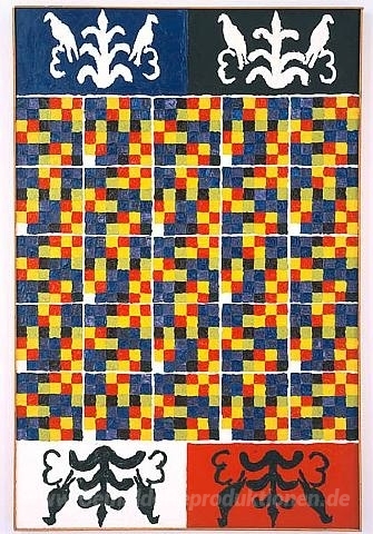 Wir bieten Ihnen eine handgefertigte Reproduktion auf Leinwand des berühmten Kunstwerks 'Göttliche Analogie 4' von Alfred Jensen, aus dem Reproduktionsmuseum.