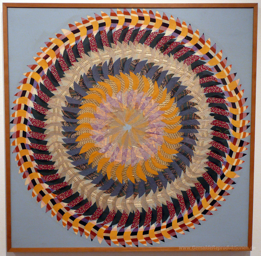 Wir bieten Ihnen eine handgefertigte Reproduktion auf Leinwand des berühmten Kunstwerks 'Goldene Pinwheel' von Miriam Schapiro, aus dem Reproduktionsmuseum.