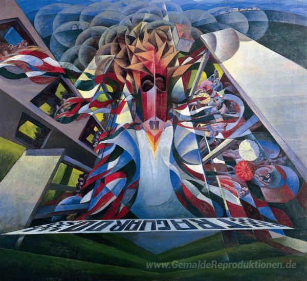 Wir bieten Ihnen eine handgefertigte Reproduktion auf Leinwand des berühmten Kunstwerks 'Il Trittico della Velocità: L'Arrivo' von Gerardo Dottori, aus dem Reproduktionsmuseum.
