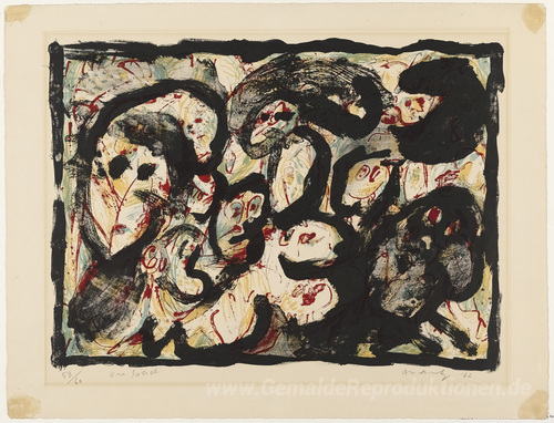 Wir bieten Ihnen eine handgefertigte Reproduktion auf Leinwand des berühmten Kunstwerks 'In Gesellschaft (société en)' von Pierre Alechinsky, aus dem Reproduktionsmuseum.