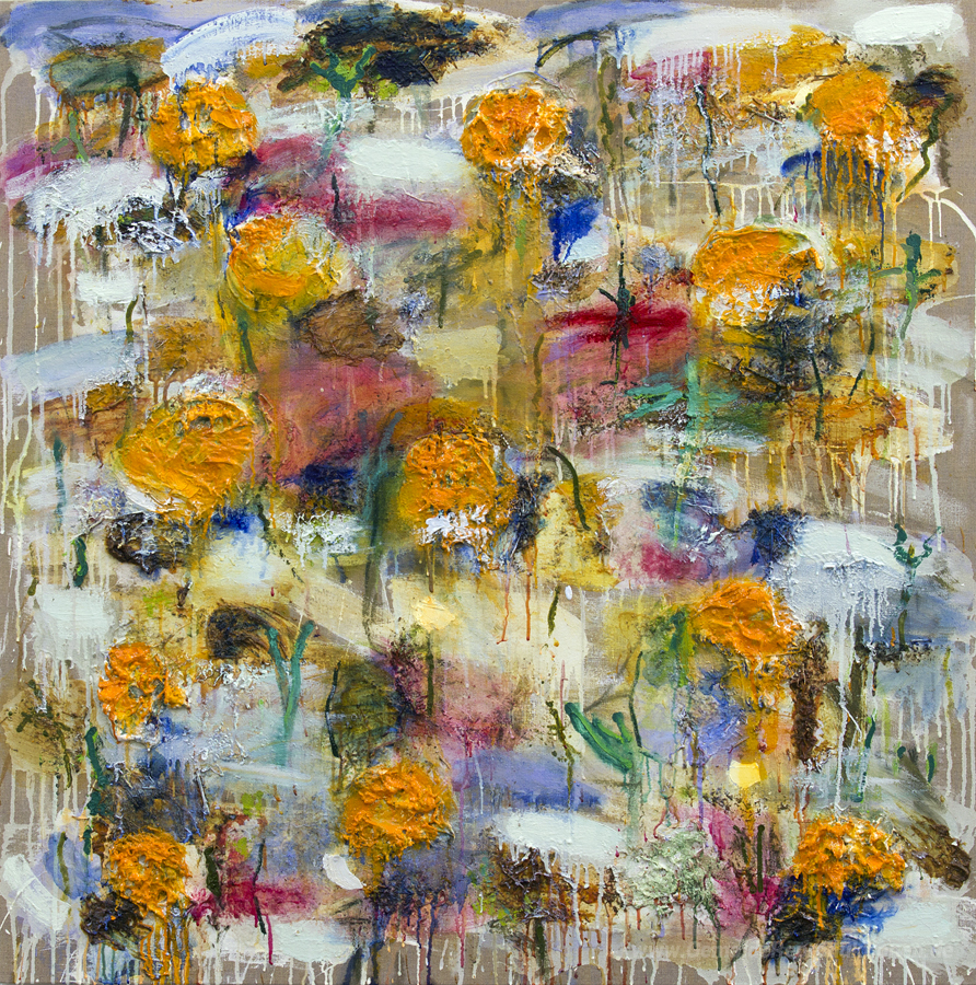 Wir bieten Ihnen eine handgefertigte Reproduktion auf Leinwand des berühmten Kunstwerks 'Kürbisfeld III' von Joan Snyder, aus dem Reproduktionsmuseum.