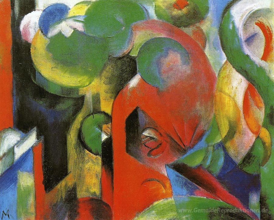Wir bieten Ihnen eine handgefertigte Reproduktion auf Leinwand des berühmten Kunstwerks 'Kleine Komposition III' von Franz Marc, aus dem Reproduktionsmuseum.