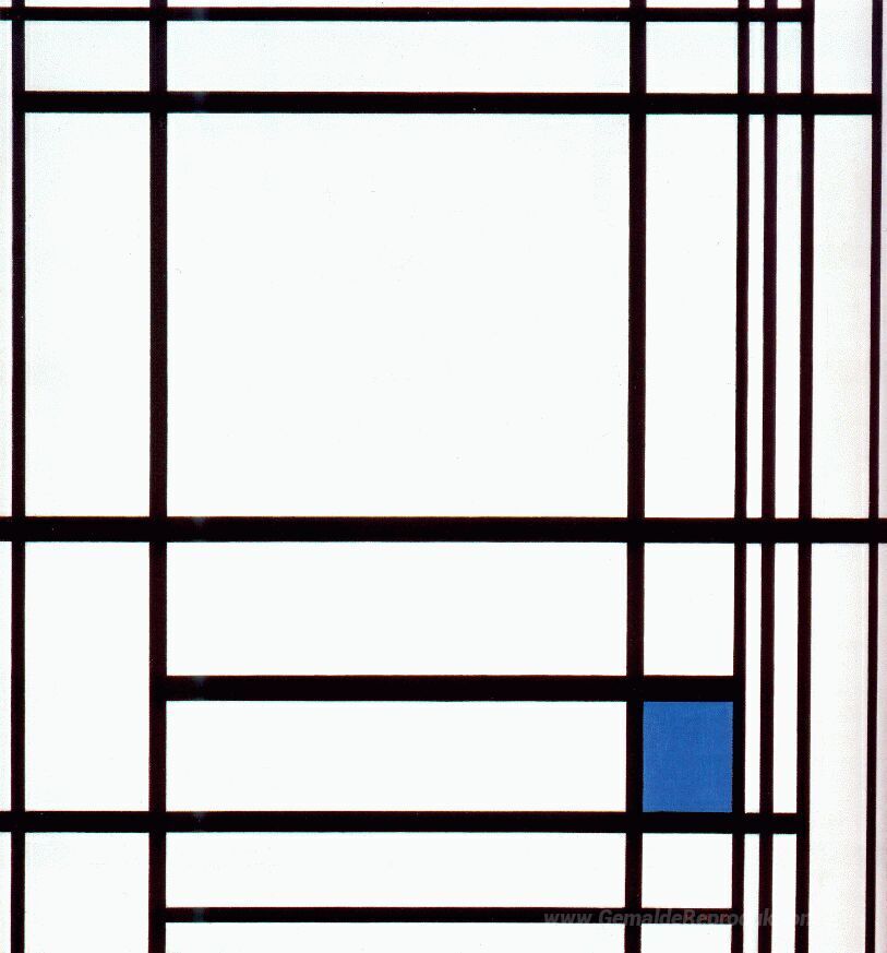 Wir bieten Ihnen eine handgefertigte Reproduktion auf Leinwand des berühmten Kunstwerks 'Komposition mit Blau' von Piet Mondrian, aus dem Reproduktionsmuseum.
