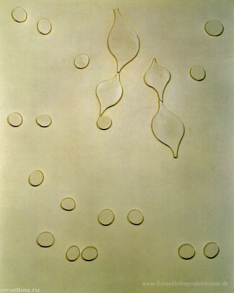 Wir bieten Ihnen eine handgefertigte Reproduktion auf Leinwand des berühmten Kunstwerks 'Leafage und Drops' von Jean Arp, aus dem Reproduktionsmuseum.