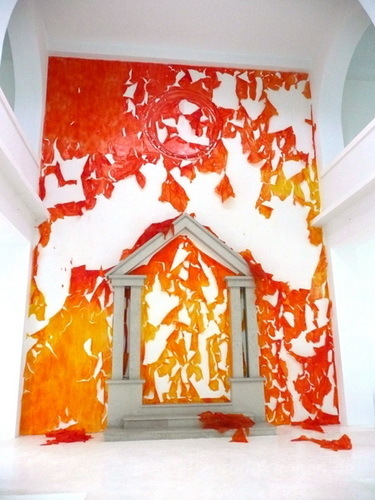Wir bieten Ihnen eine handgefertigte Reproduktion auf Leinwand des berühmten Kunstwerks 'Les murs de Pellicules Orange' von Michel Blazy, aus dem Reproduktionsmuseum.