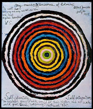 Wir bieten Ihnen eine handgefertigte Reproduktion auf Leinwand des berühmten Kunstwerks 'Meine Einheit, ein Universum der Farben' von Alfred Jensen, aus dem Reproduktionsmuseum.