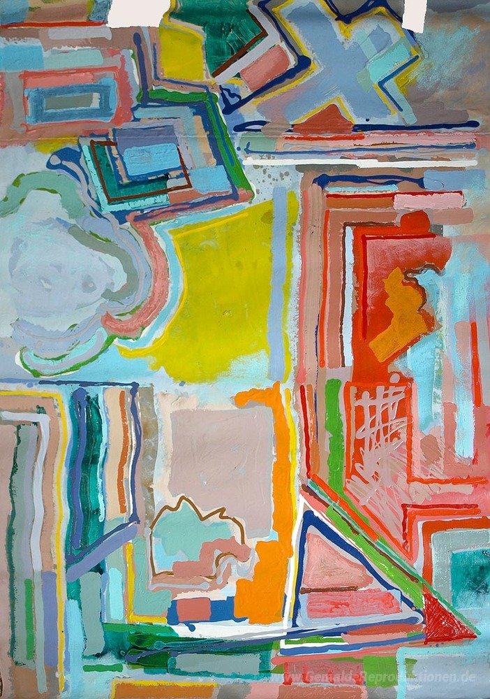 Wir bieten Ihnen eine handgefertigte Reproduktion auf Leinwand des berühmten Kunstwerks 'Ohne Titel [rot, blau]' von Edward Avedisian, aus dem Reproduktionsmuseum.