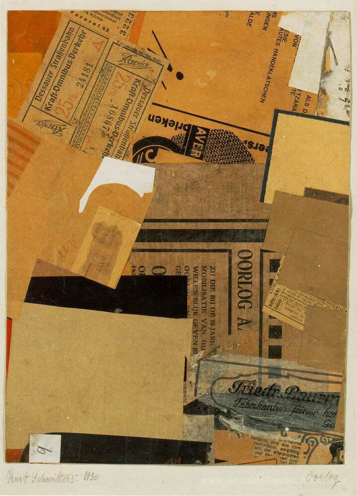 Wir bieten Ihnen eine handgefertigte Reproduktion auf Leinwand des berühmten Kunstwerks 'Oorlog' von Kurt Schwitters, aus dem Reproduktionsmuseum.