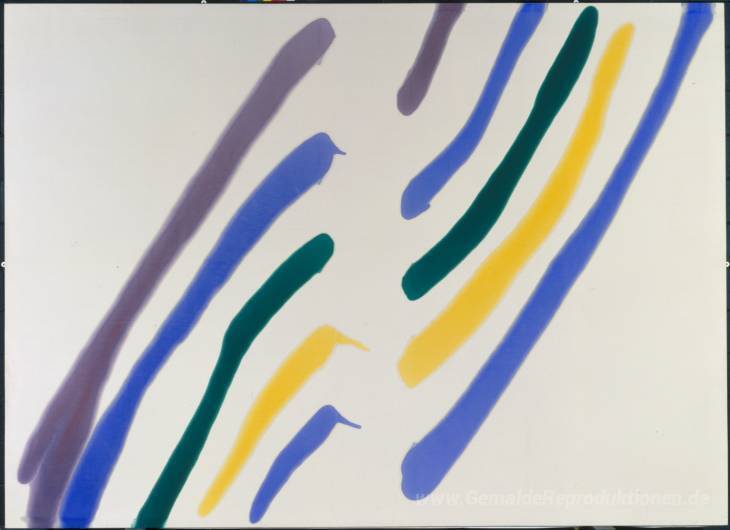 Wir bieten Ihnen eine handgefertigte Reproduktion auf Leinwand des berühmten Kunstwerks 'Phi' von Morris Louis, aus dem Reproduktionsmuseum.