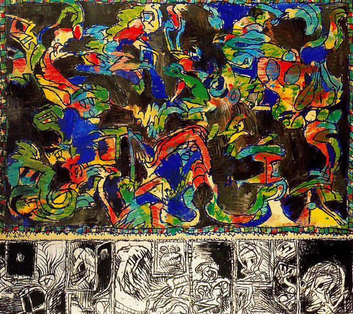 Wir bieten Ihnen eine handgefertigte Reproduktion auf Leinwand des berühmten Kunstwerks 'Spiegel-Workshop' von Pierre Alechinsky, aus dem Reproduktionsmuseum.