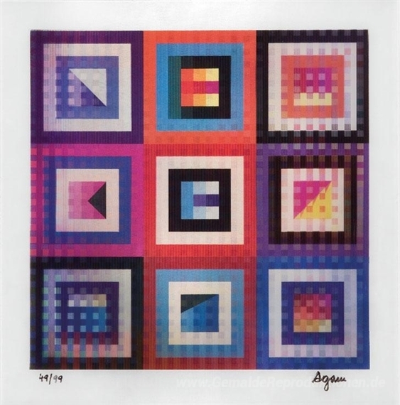 Wir bieten Ihnen eine handgefertigte Reproduktion auf Leinwand des berühmten Kunstwerks 'Versteckte Regenbogen-x9' von Yaacov Agam, aus dem Reproduktionsmuseum.