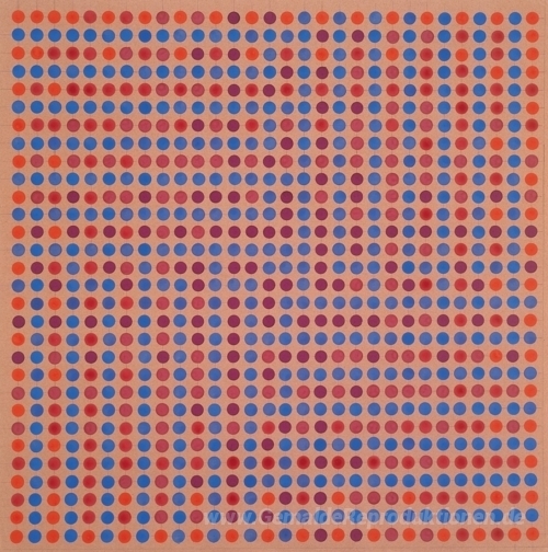 Wir bieten Ihnen eine handgefertigte Reproduktion auf Leinwand des berühmten Kunstwerks 'Vibration des adjacents rouge-bleu, fond violet' von Horacio Garcia-Rossi, aus dem Reproduktionsmuseum.