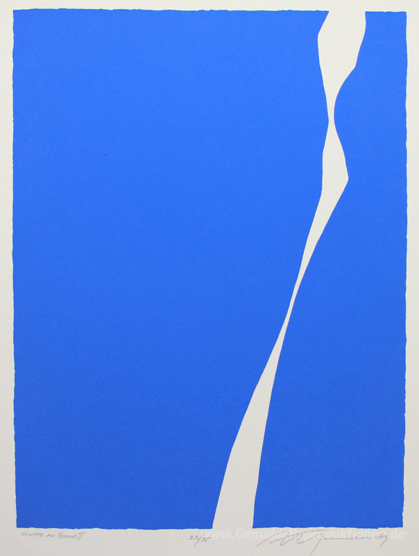 Wir bieten Ihnen eine handgefertigte Reproduktion auf Leinwand des berühmten Kunstwerks 'Weiß auf Blau II' von Adja Yunkers, aus dem Reproduktionsmuseum.