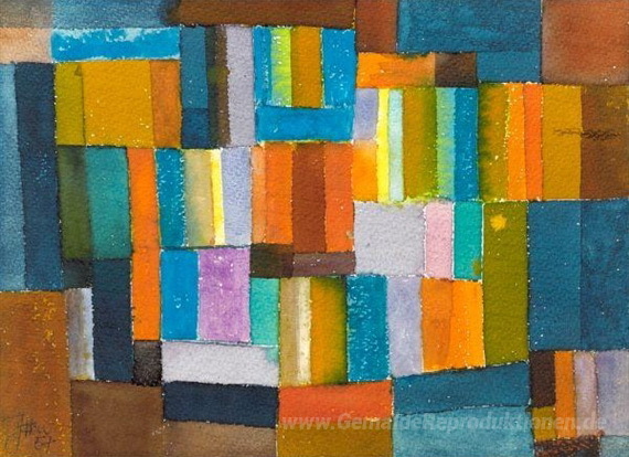 Wir bieten Ihnen eine handgefertigte Reproduktion auf Leinwand des berühmten Kunstwerks 'Zusammensetzung in Orange und Blau-Grün' von Johannes Itten, aus dem Reproduktionsmuseum.