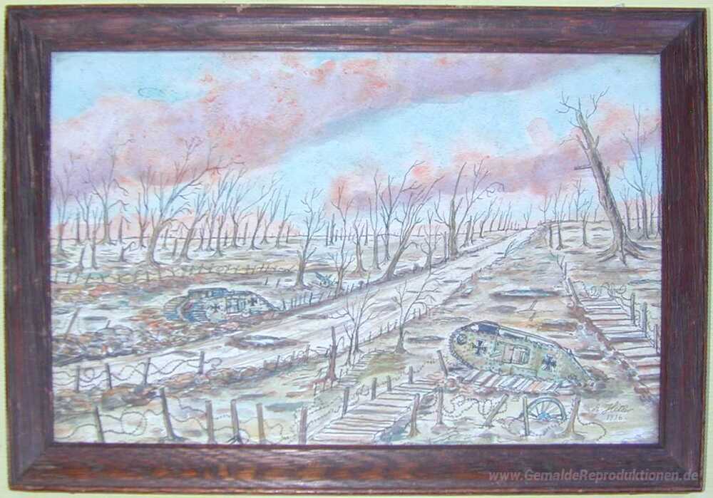 Wir bieten Ihnen eine handgefertigte Reproduktion auf Leinwand des berühmten Kunstwerks 'Tank Battleground' von Adolf Hitler, aus dem Reproduktionsmuseum.