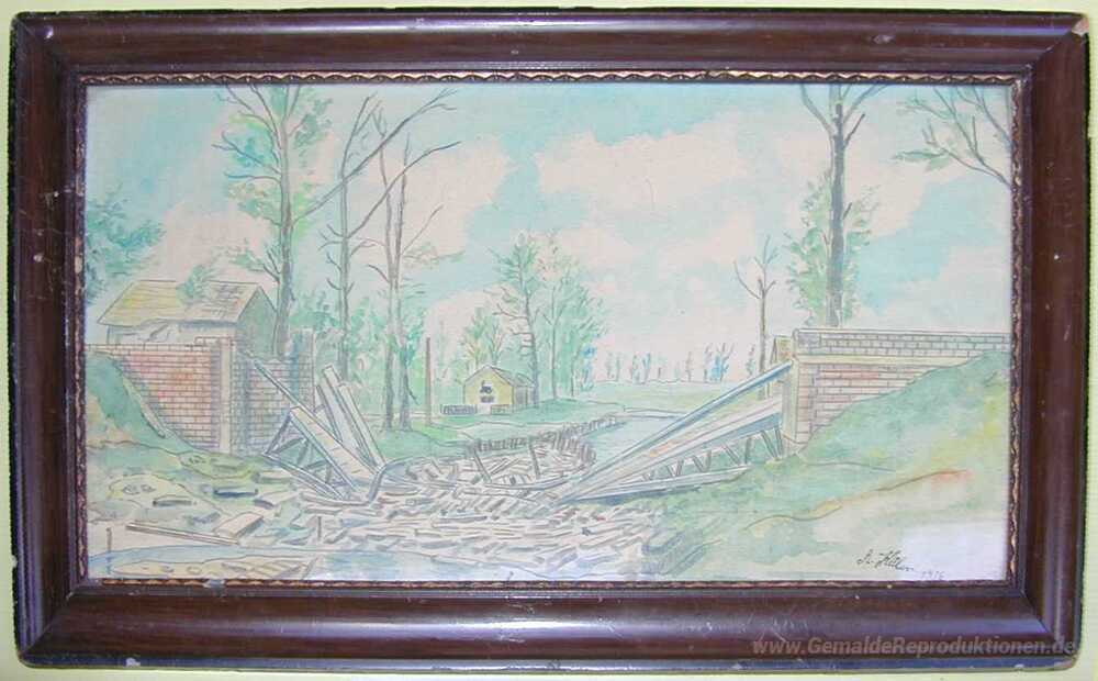 Wir bieten Ihnen eine handgefertigte Reproduktion auf Leinwand des berühmten Kunstwerks 'Zerstörte Brücke' von Adolf Hitler, aus dem Reproduktionsmuseum.