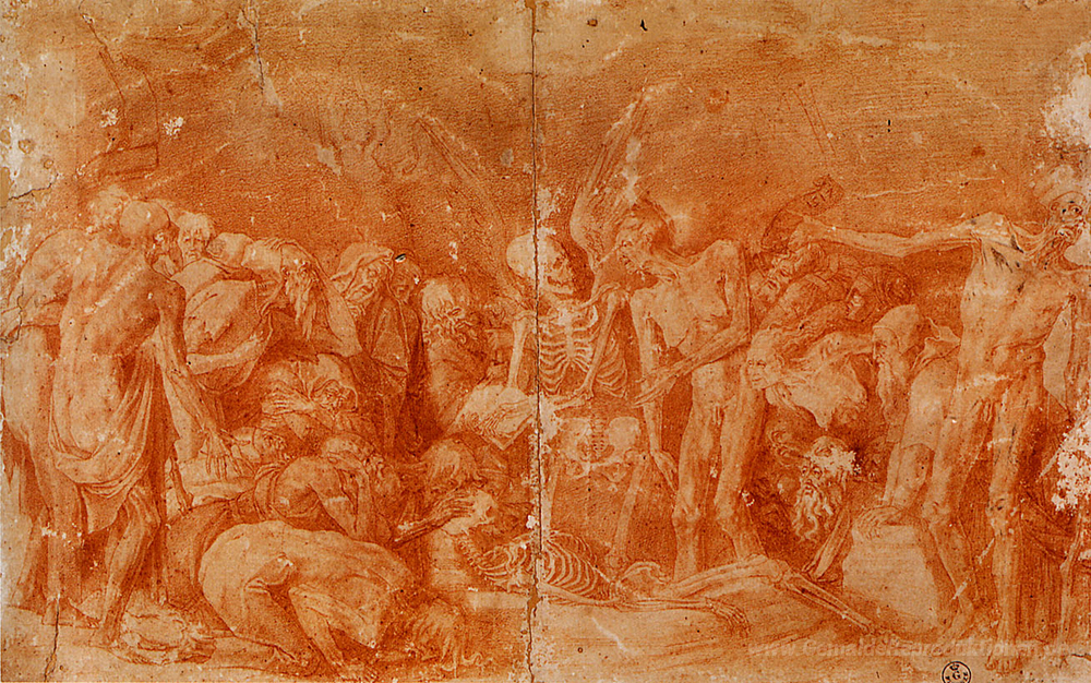 Wir bieten Ihnen eine handgefertigte Reproduktion auf Leinwand des berühmten Kunstwerks 'Allegoria macabra' von Rosso Fiorentino, aus dem Reproduktionsmuseum.