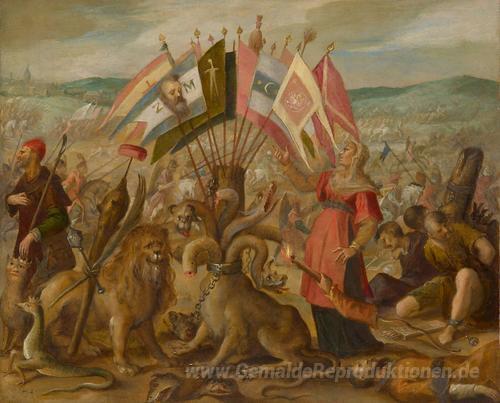 Wir bieten Ihnen eine handgefertigte Reproduktion auf Leinwand des berühmten Kunstwerks 'Allegorie auf die Schlacht von Braşov' von Hans von Aachen, aus dem Reproduktionsmuseum.