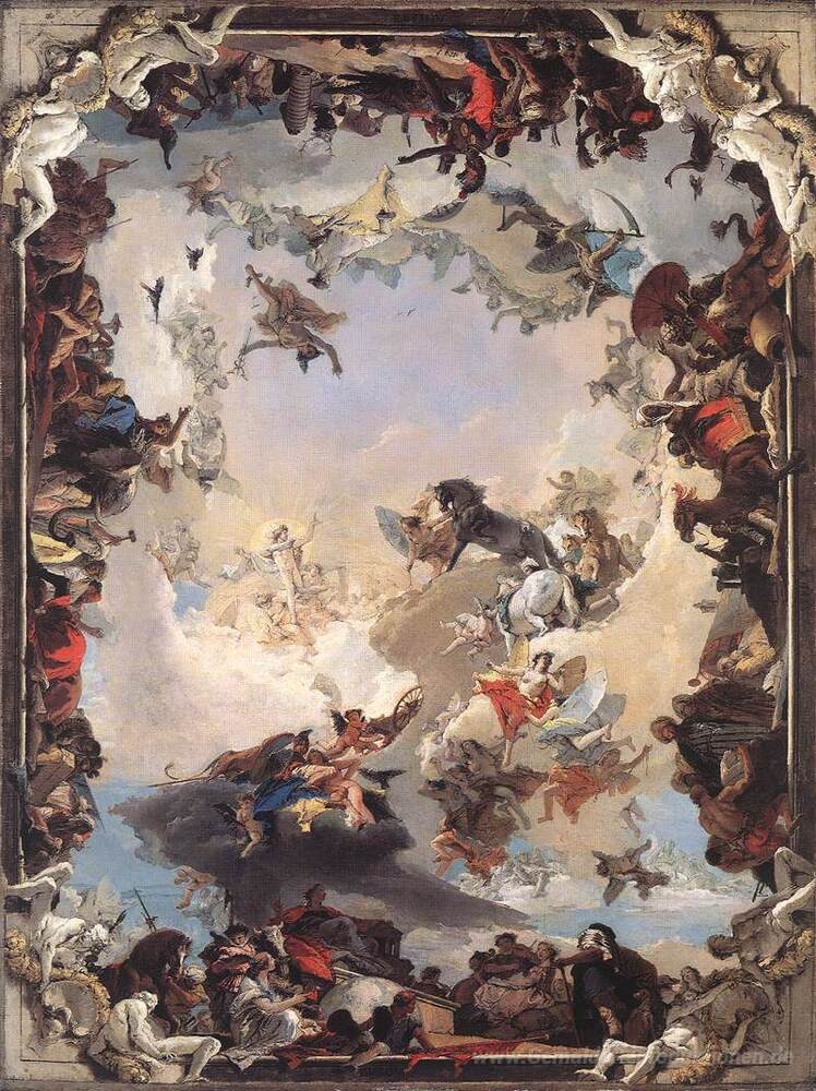 Willkommen in der faszinierenden Welt der Ölgemälde, wo kunstvolle Meisterwerke dazu beitragen, das Ambiente Ihres Raumes zu bereichern. Eines dieser bemerkenswerten Kunstwerke ist Allegorie der Planeten und Kontinente, geschaffen von dem visionären Künstler Giovanni Battista Tiepolo. Seine Werke sind berühmt für die Detailverliebtheit und die dynamische Darstellung von Licht und Schatten, die eine lebendige und einladende Atmosphäre schaffen.