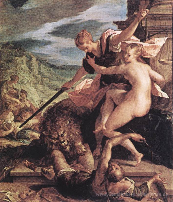 Wir bieten Ihnen eine handgefertigte Reproduktion auf Leinwand des berühmten Kunstwerks 'Allegorie oder Der Triumph der Gerechtigkeit' von Hans von Aachen, aus dem Reproduktionsmuseum.