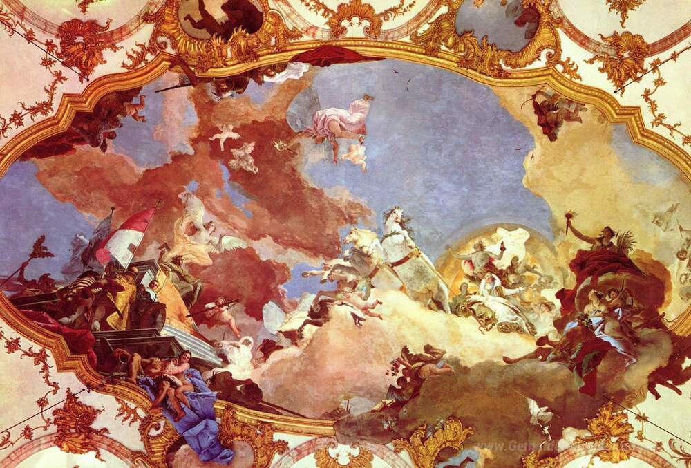 Wir bieten Ihnen eine handgefertigte Reproduktion auf Leinwand des berühmten Kunstwerks 'Apollo führt Friedrich Barbarossa Beatrix von Burgund' von Giovanni Battista Tiepolo, aus dem Reproduktionsmuseum.