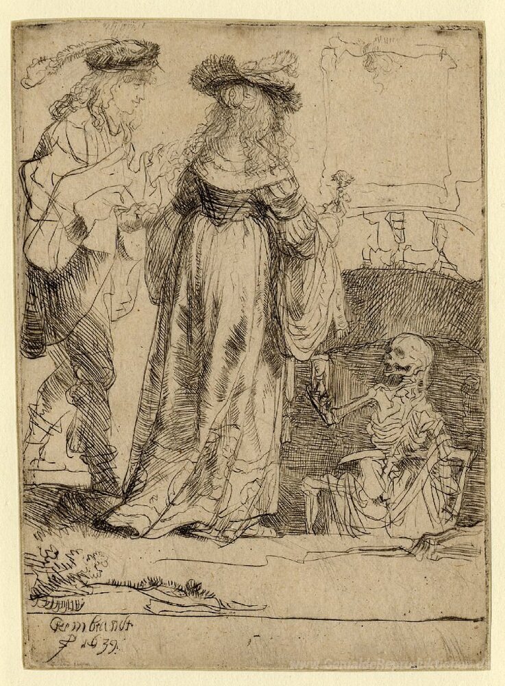 Wir bieten Ihnen eine handgefertigte Reproduktion auf Leinwand des berühmten Kunstwerks 'Der Tod erscheint, zu einem Hochzeitspaar aus einem offenen Grab' von Rembrandt, aus dem Reproduktionsmuseum.