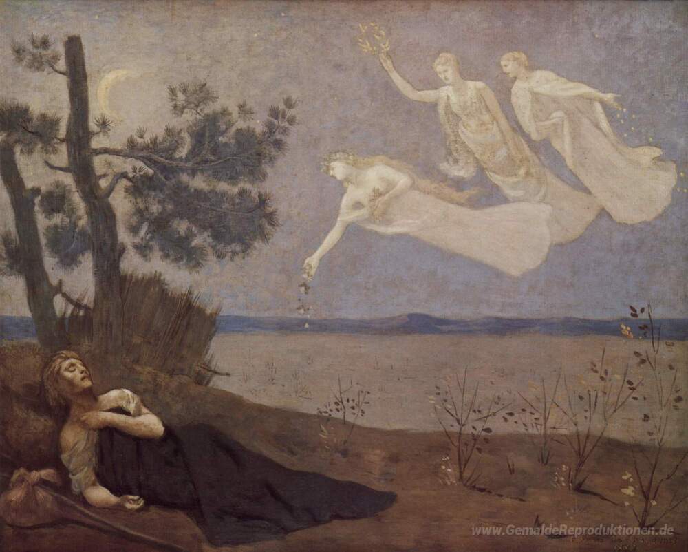Wir bieten Ihnen eine handgefertigte Reproduktion auf Leinwand des berühmten Kunstwerks 'Der Traum: "Im Schlaf sah er Liebe, Ruhm und Reichtum erscheinen' von Pierre Puvis de Chavannes, aus dem Reproduktionsmuseum.