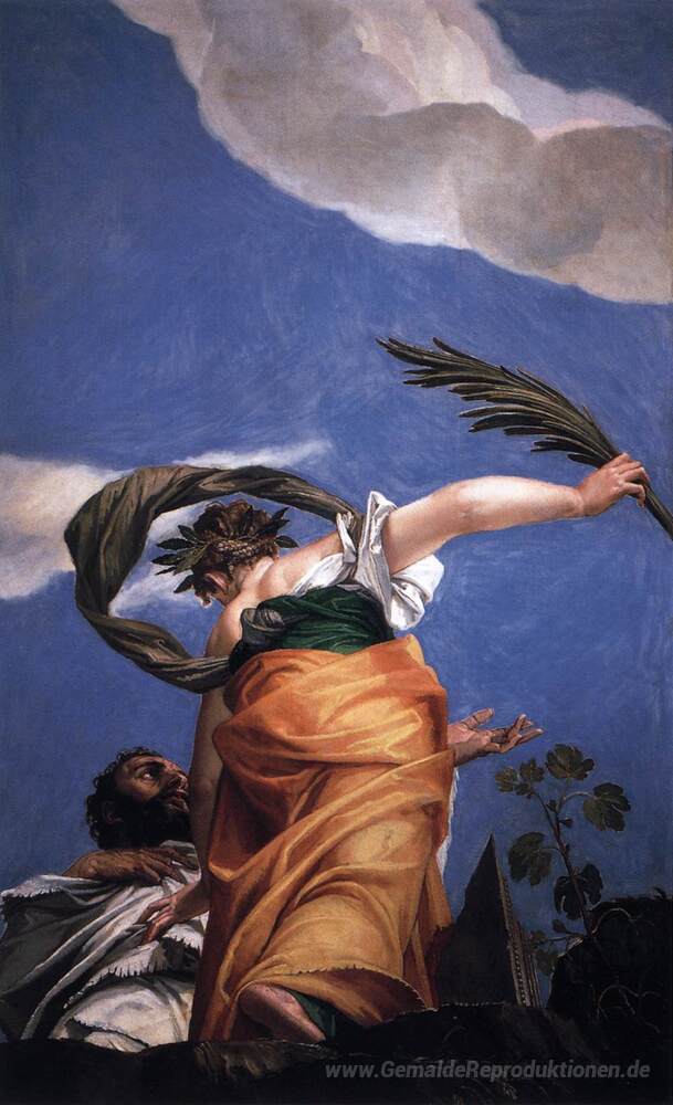 Wir bieten Ihnen eine handgefertigte Reproduktion auf Leinwand des berühmten Kunstwerks 'Der Triumph der Tugend über die Laster' von Paolo Veronese, aus dem Reproduktionsmuseum.