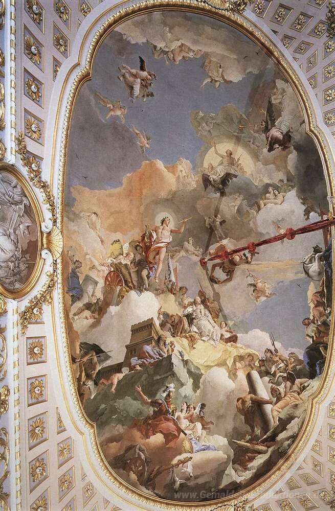 Wir bieten Ihnen eine handgefertigte Reproduktion auf Leinwand des berühmten Kunstwerks 'Die Apotheose der spanischen Monarchie' von Giovanni Battista Tiepolo, aus dem Reproduktionsmuseum.