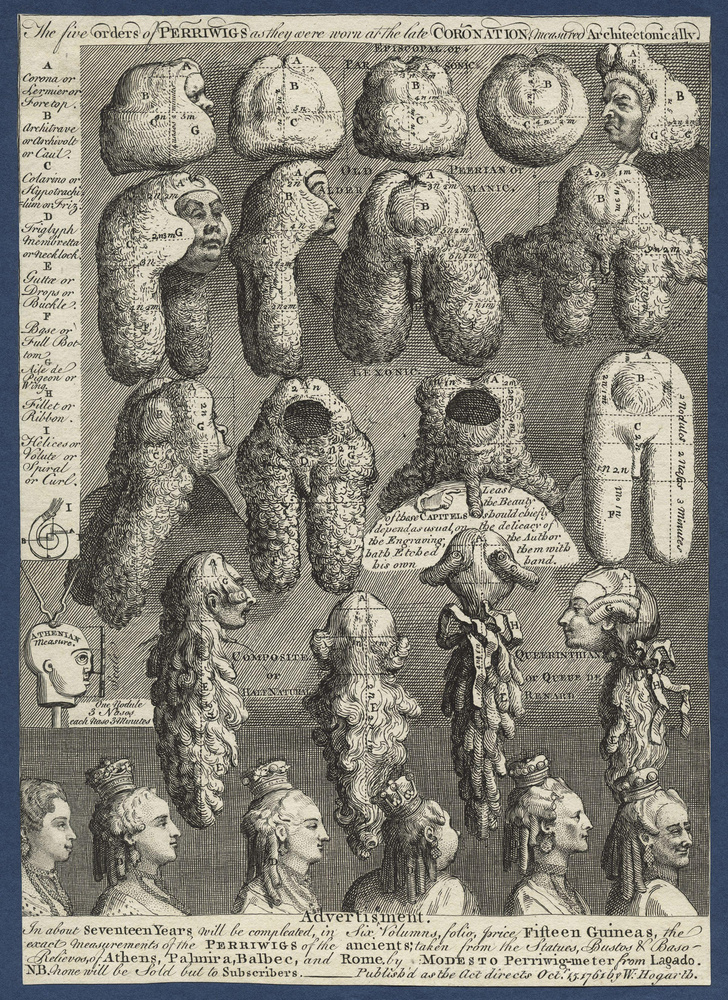 Wir bieten Ihnen eine handgefertigte Reproduktion auf Leinwand des berühmten Kunstwerks 'Die fünf Säulenordnungen Perriwigs' von William Hogarth, aus dem Reproduktionsmuseum.