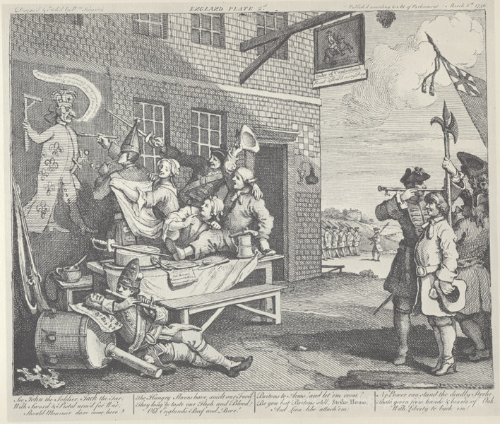 Wir bieten Ihnen eine handgefertigte Reproduktion auf Leinwand des berühmten Kunstwerks 'Die Invasion, England' von William Hogarth, aus dem Reproduktionsmuseum.