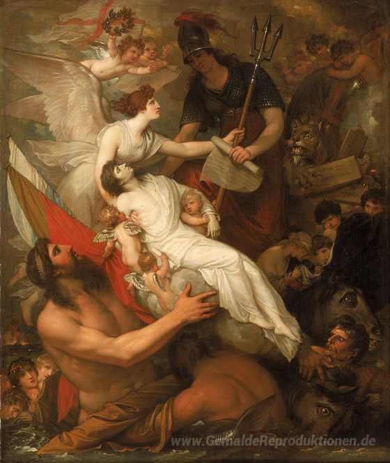 Wir bieten Ihnen eine handgefertigte Reproduktion auf Leinwand des berühmten Kunstwerks 'Die Unsterblichkeit von Nelson' von Benjamin West, aus dem Reproduktionsmuseum.