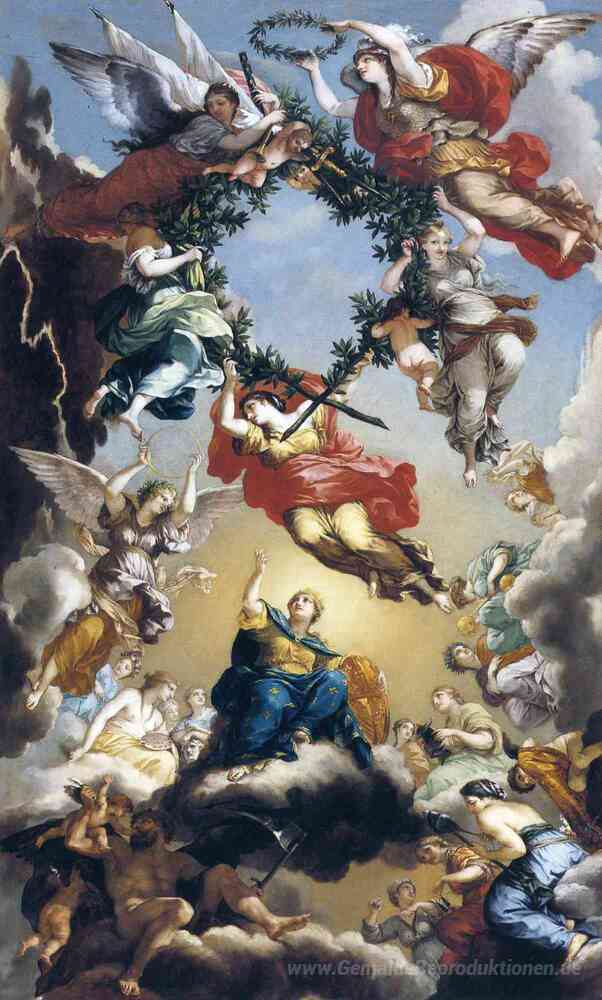 Wir bieten Ihnen eine handgefertigte Reproduktion auf Leinwand des berühmten Kunstwerks 'Die Verherrlichung der Regierung von Burgund' von Pierre-Paul Prud'hon, aus dem Reproduktionsmuseum.